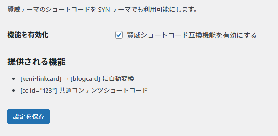 「機能を有効化」の「賢威ショートコード互換機能を有効にする」にチェックをいれ、「設定を保存」で有効になります。