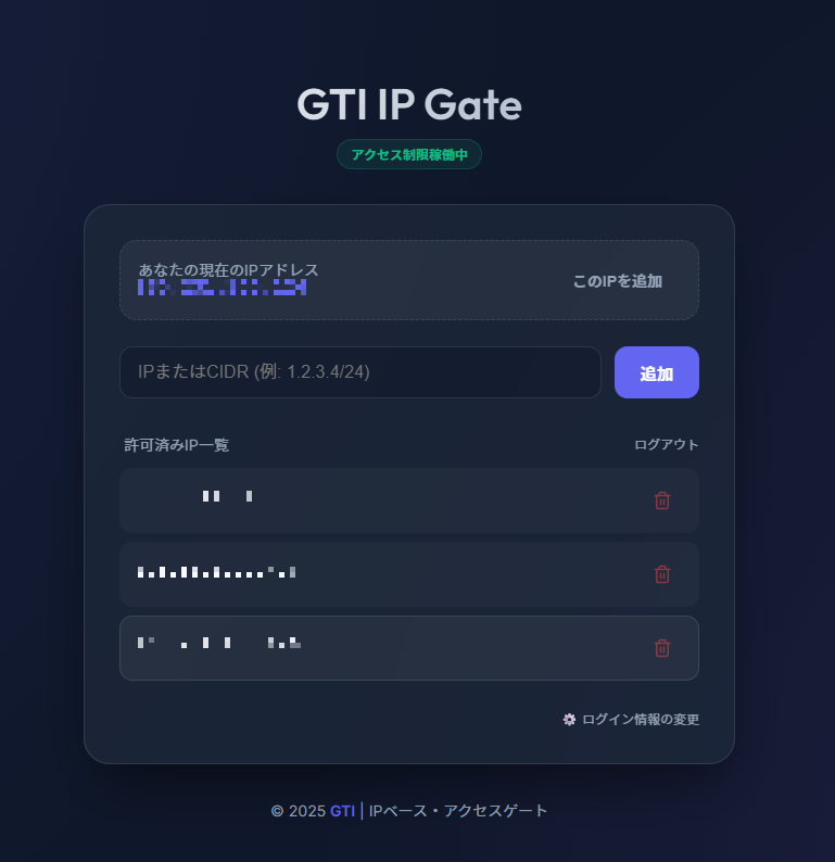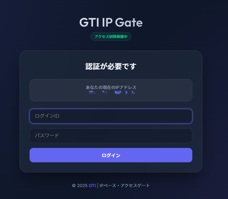 GTI IP Gate には、一般的な会員管理や多段認証のログイン画面は存在しません。