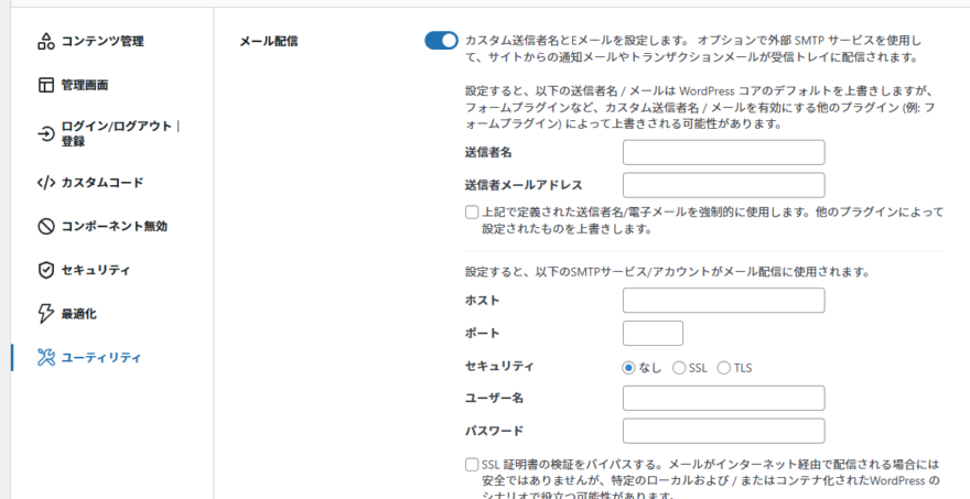 メールを送るためだけに専用プラグイン(WP SMTPなど)を1つ増やすのは、管理の手間もセキュリティリスクも増えます。ASEなら、サイトの高度な設定ついでにSMTPも統合できるので、管理画面がスッキリするからです。