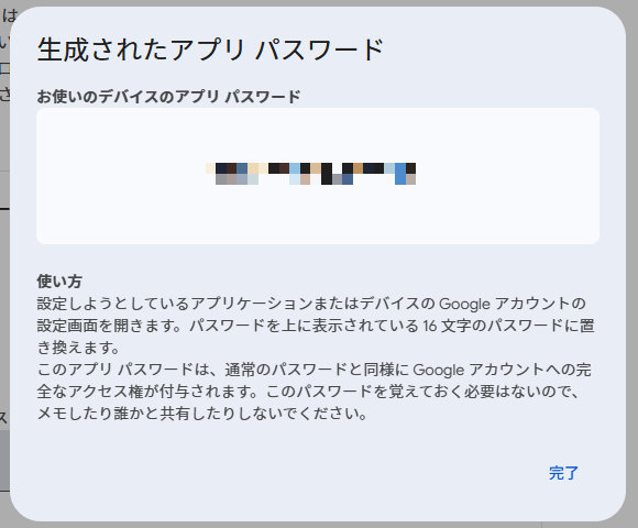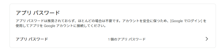 Googleのセキュリティ仕様により、「アプリパスワード」の発行が必要です。